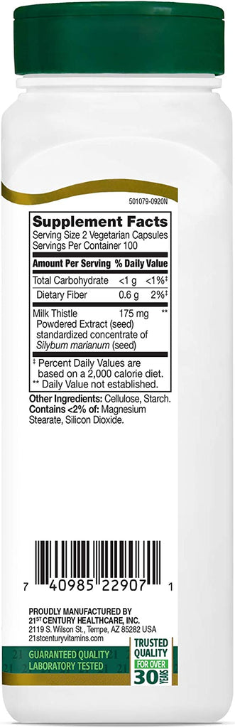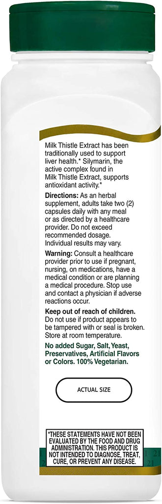 Milk Thistle Extract has been traditionally used to support liver health, with antioxidant activity from its active complex, Silymarin. 21st Century's standardized herbal extracts are extensively tested for maximum benefits. No added sugar, salt, yeast, preservatives, artificial flavors or colors. 100% vegetarian formula. Manufactured in a cGMP facility with strict quality and purity standards.
