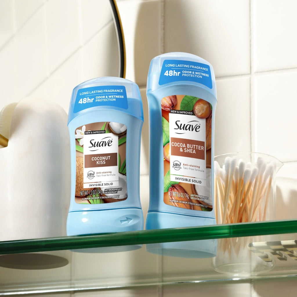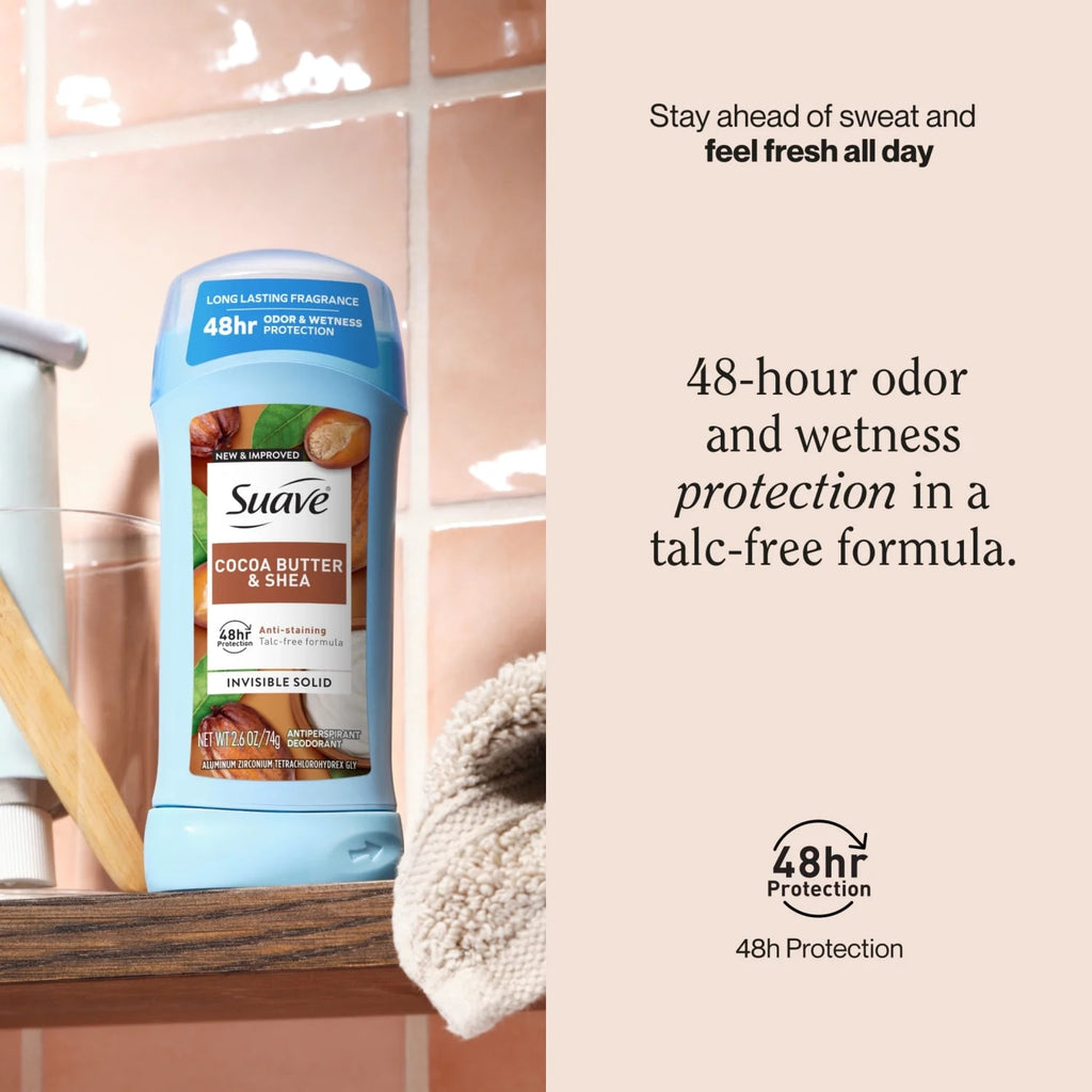 Experience the reliable freshness of Suave Cocoa Butter & Shea Invisible Female Antiperspirant Deodorant Stick, expertly crafted to keep you feeling fresh and confident morning to night. Suave Cocoa Butter & Shea Deodorant delivers trustworthy 48-hour odor and wetness protection, keeping you fresh with notes of cocoa butter, coconut, and vanilla. This talc-free antiperspirant deodorant, designed for women, offers maximum effectiveness without sacrificing comfort. The invisible, anti-staining female deodorant stick applies smoothly, leaving no white marks on your clothes, so you can wear what you love without worry. Suave Cocoa Butter & Shea is designed to be gentle on sensitive skin while effectively combating sweat and odor, providing reliable protection and comfort for everyday use. Choose from a variety of fragrances, including Aloe & Rose Water, Cocoa Butter & Shea, Everlasting Sunshine, Mango Citrus, Powder, Fresh, Sweet Pea & Violet, Tropical Paradise, and Wild Cherry Blossom, to find the perfect match for your lifestyle. Committed to quality and accessibility, Suave empowers everyone to look, smell, and feel their best every day. For over 75 years, Suave has offered professional-quality haircare and skincare products for the entire family. The Suave mission is to make gold standard quality attainable to all, so everyone can look good, smell good, and feel good every day. This bundle contains a total of 3 single packs of Suave Antiperspirant Deodorant For Women, 48hr Protection, Cocoa Butter & Shea 2.6 oz per pack plus 3 My Outlet Mall Resealable Storage Pouches.