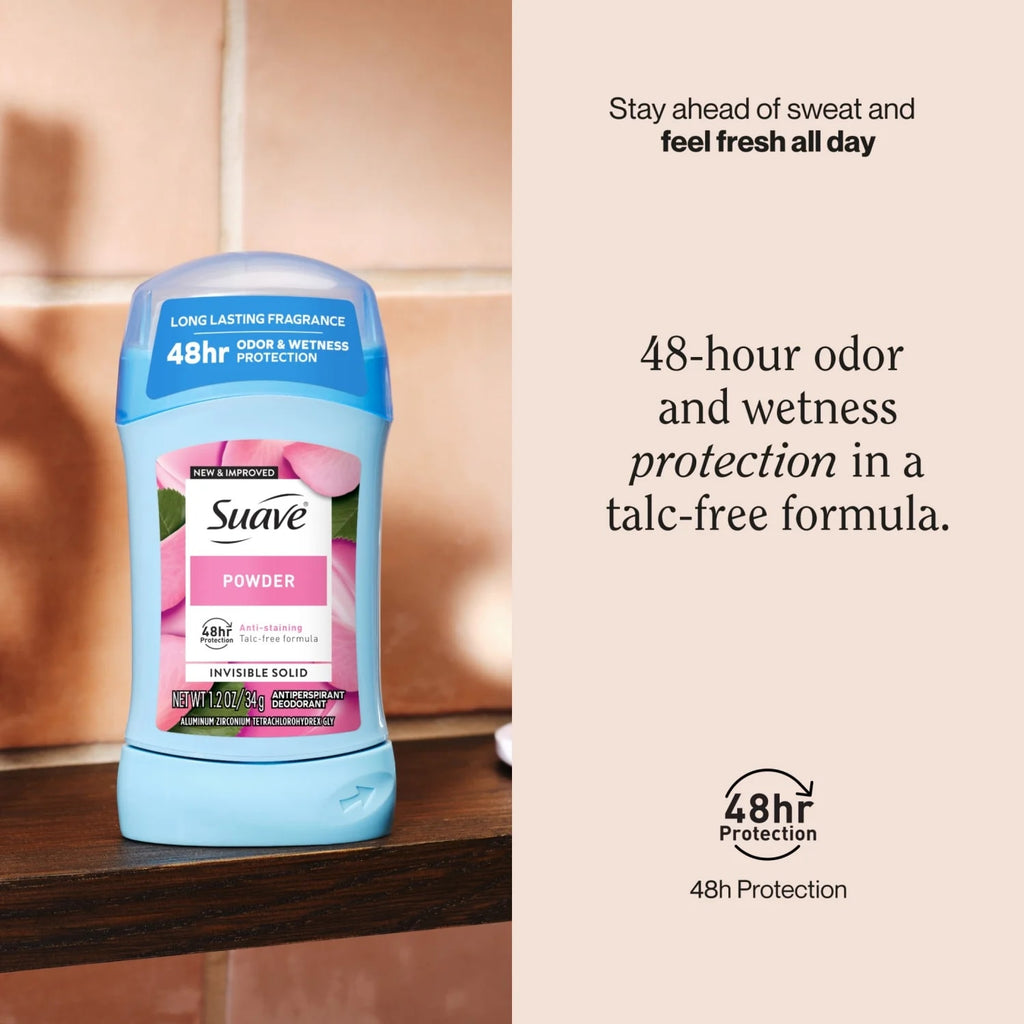 Experience the reliable freshness of Suave Powder Invisible Female Antiperspirant Deodorant Stick, expertly crafted to keep you feeling fresh and confident morning to night. This improved formula deodorant delivers reliable 48-hour protection against sweat and odor, with a light powder fragrance. Talc-free with 20% more “sweat-stopping” ingredients than our original formulation, our antiperspirant deodorant for women ensures maximum effectiveness without compromising comfort. The invisible, anti-staining female deodorant stick applies smoothly, leaving no white marks on your clothes, so you can wear what you love without worry. Suave Powder is designed to be gentle on sensitive skin while effectively combating sweat and odor, providing reliable protection and comfort for everyday use. Choose from a variety of fragrances, including Aloe & Rose Water, Cocoa Butter & Shea, Everlasting Sunshine, Mango Citrus, Powder, Fresh, Sweet Pea & Violet, Tropical Paradise, and Wild Cherry Blossom, to find the perfect match for your lifestyle. Committed to quality and accessibility, Suave empowers everyone to look, smell, and feel their best every day. For over 75 years, Suave has offered professional-quality haircare and skincare products for the entire family. The Suave mission is to make gold standard quality attainable to all, so everyone can look good, smell good, and feel good every day. This bundle contains a total of 2 single packs of Suave Antiperspirant Deodorant For Women, 48hr Protection, Powder 1.2 oz per pack plus 3 My Outlet Mall Resealable Storage Pouches.