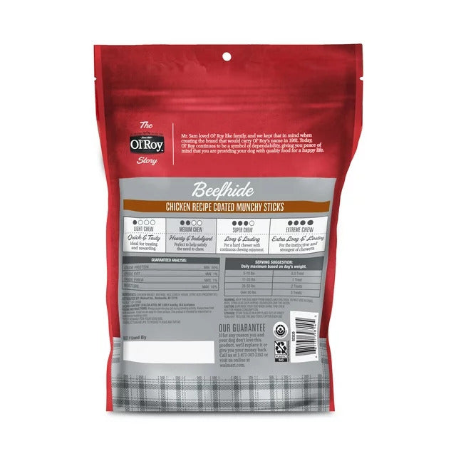 - BUNDLE INCLUDES: This bundle contains a total of 2 single packs of Ol' Roy Beefhide Coated Munchy Sticks, Chicken Recipe, Dry Training Treats for Dog 16.9 oz plus 3 My Outlet Mall Resealable Storage Pouches.