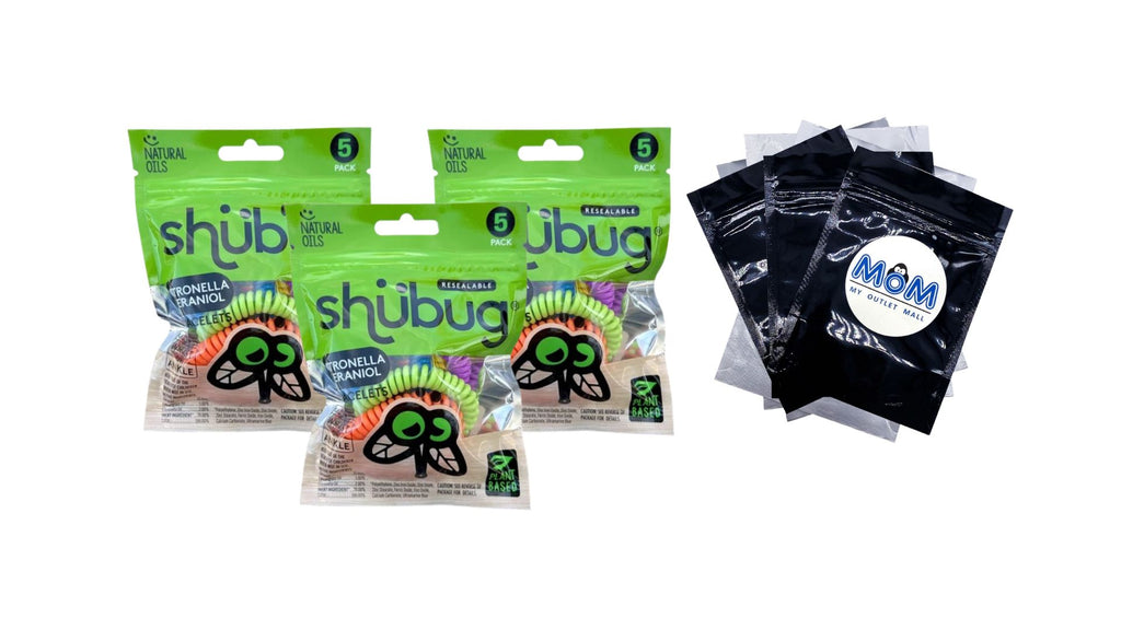 BUNDLE INCLUDES: This bundle contains a total of 3 single packs of Shubug Citronella and Geraniol Coil Bracelet Band Insect Repellant, Multi-Color, Deet Free 5 Count plus 3 My Outlet Mall Resealable Storage Pouches.