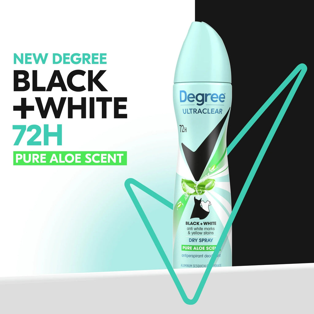 Degree Ultra Clear Antiperspirant Deodorant Dry Spray for Women Pure Aloe Scent with Black+White Anti White Marks and Yellow Stains System, 3.8 oz. Degree UltraClear Black+White Pure Aloe Scent Antiperspirant Deodorant Dry Spray is the perfect solution for staying fresh and confident, no matter the color of your outfit. Whether it's a crisp white shirt or a sleek black dress, this antiperspirant is designed with advanced technology to offer 72-hour sweat and odor protection without leaving behind white marks or yellow stains. Its innovative formula features anti-white mark and yellow stain technology, ensuring that your clothes stay looking as good as you do. The unique MotionSense technology in Degree UltraClear Black+White Pure Aloe Scent Antiperspirant Deodorant is engineered to respond to your body's movements. For adult use. This bundle contains a total of 3 single packs of Degree Ultra Clear Antiperspirant Deodorant Spray for Women Aloe Scent with Anti White Marks 3.8 oz per pack plus 3 My Outlet Mall Resealable Storage Pouches.