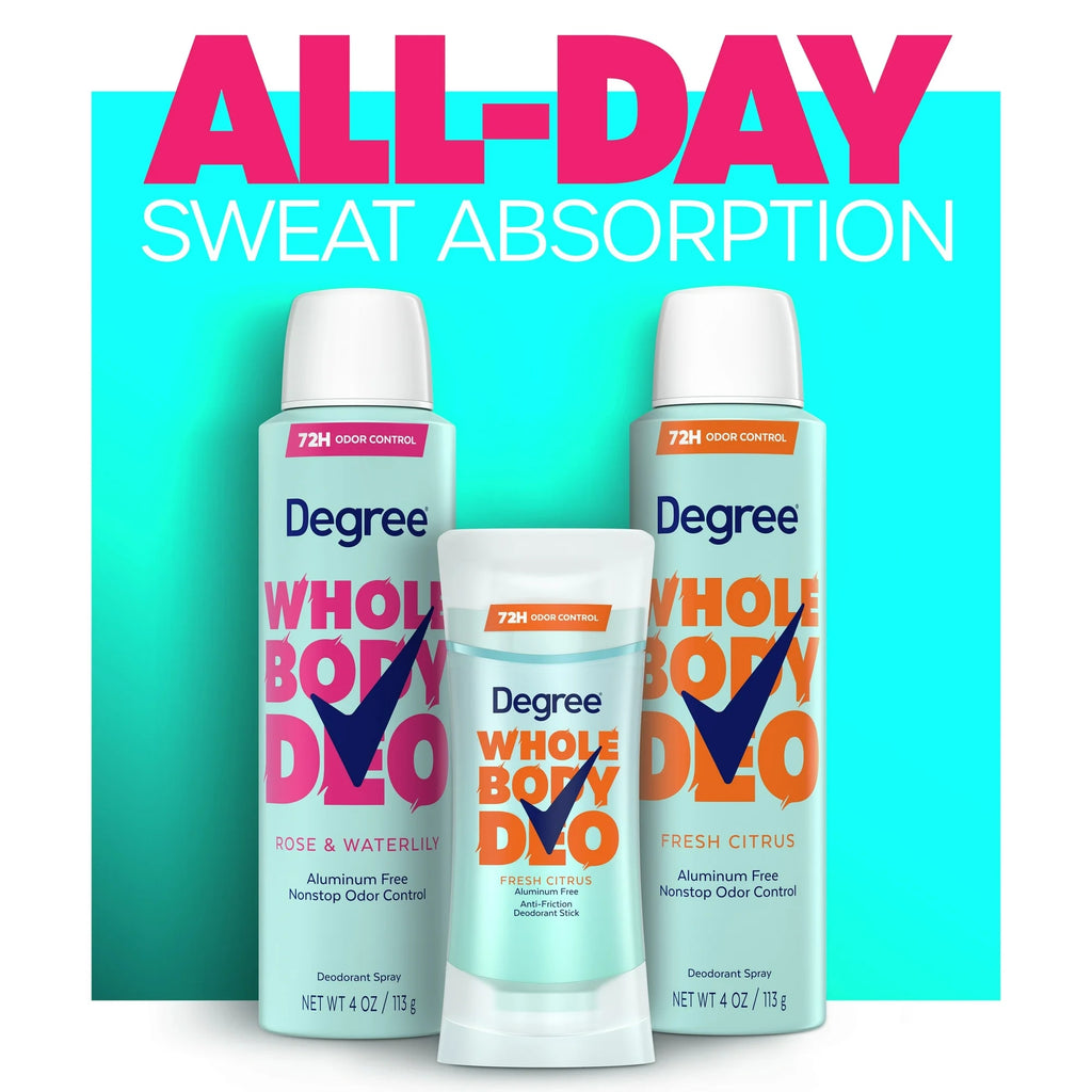 Degree Women Whole Body Deodorant Spray for Women Rose & Waterlily Scent Aluminum Free, 4 oz. Degree Women’s Whole Body Deodorant Spray is your go-to solution for staying fresh and confident all day long. It is as affordable as it is effective: This deodorant provides up to 72 hours of odor protection, ensuring you remain unstoppable without breaking your wallet. This whole body deodorant is perfect to use anywhere you want to tackle odor, including your pits, under boobs, lower back, thighs, feet, and more. Features a fresh and citrus fragrance with a clean feel, making you smell amazing throughout the day. Plus, it’s dermatologist-tested and aluminum-free. The application is simple and easy. Hold the deodorant spray 6 inches from your skin and spray where you want to fight odor. Avoid your face and intimate areas, and let it dry. You’ll love that it leaves no residue and no white marks on your clothes, so you can wear your favorite outfits with confidence. Whether you’re hitting the gym, running errands, or just going about your day, Degree’s Whole Body Deodorant Spray keeps you feeling fresh everywhere. For adult use. This bundle contains a total of 3 single packs of Degree Women Whole Body Deodorant Spray for Women Rose & Waterlily Scent Aluminum Free 4 oz per pack plus 3 My Outlet Mall Resealable Storage Pouches.